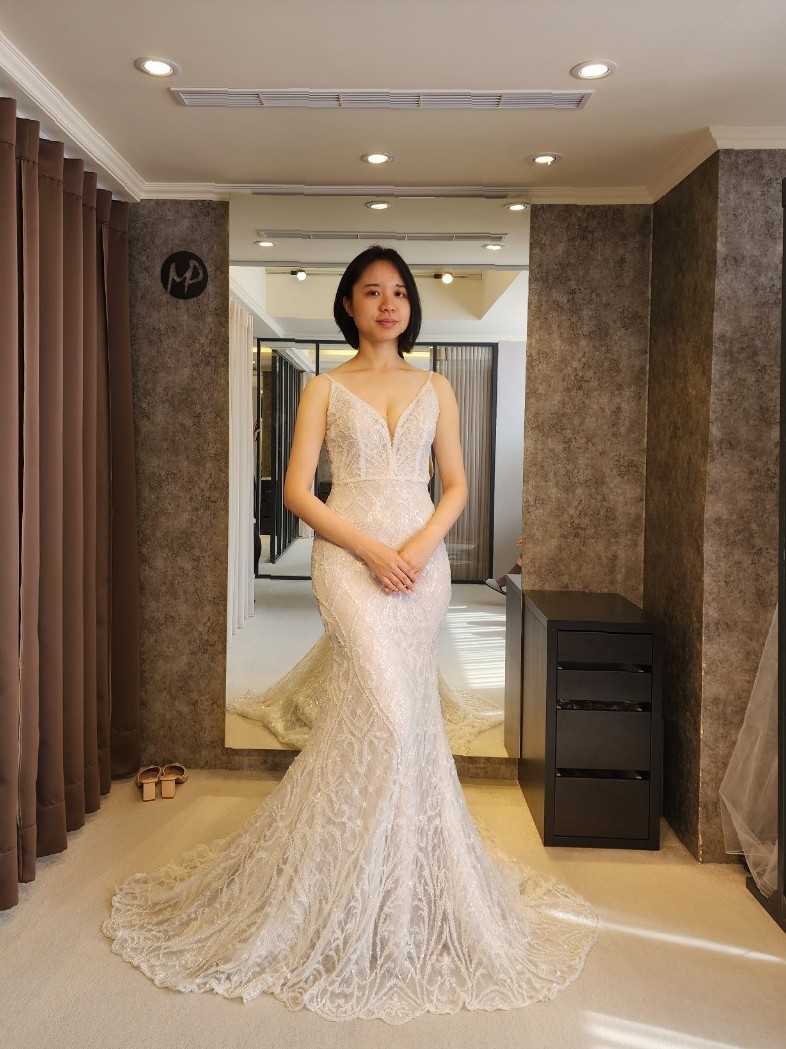 原因是我看了晚禮服們好像都覺得還好,只有堅持一定要有一套是「魚尾x裸紗」👰🏻♀️